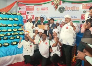 ಚೆನ್ನೈಸ್ ಅಮಿರ್ತಾ ಇನ್’ಸ್ಟಿಟ್ಯೂಟ್ ಆಫ್ ಹೋಟೆಲ್ ಮ್ಯಾನೇಜ್’ಮೆಂಟ್ ವಿದ್ಯಾರ್ಥಿಗಳು ಹೊಸ ದಾಖಲೆ ನಿರ್ಮಿಸಿದ್ದಾರೆ. ಕೇವಲ 19 ನಿಮಿಷ 17 ಸೆಕೆಂಡ್'ನಲ್ಲಿ ಒಟ್ಟು 55 ಕಲ್ಲಂಗಡಿ ಹಣ್ಣುಗಳಲ್ಲಿ ರಾಷ್ಟ್ರಗೀತೆಯನ್ನು ಕೆತ್ತಿದ್ದಾರೆ.