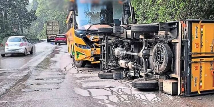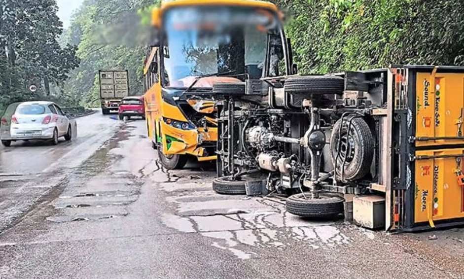 ಪುತ್ತೂರು: ರಾಷ್ಟ್ರೀಯ ಹೆದ್ದಾರಿ 75 ರ ಶಿರಾಡಿ ಘಾಟ್ ಪರಿಸರದ ಕೆಂಪಳ್ಳ ಬಳಿ ಚಾಲಕನ ನಿಯಂತ್ರಣ ತಪ್ಪಿ ಸರಕು ಸಾಗಿಸುತ್ತಿದ್ದ ಟೆಂಪೊ ಪಲ್ಟಿಯಾಗಿ, ಹೆದ್ದಾರಿಯ ಇನ್ನೊಂದು ಬದಿಯಲ್ಲಿ ಬರುತ್ತಿದ್ದ ಖಾಸಗಿ ಬಸ್ಸಿಗೆ ಡಿಕ್ಕಿ ಹೊಡೆದ ಘಟನೆ ಶುಕ್ರವಾರ ನಡೆದಿದೆ.