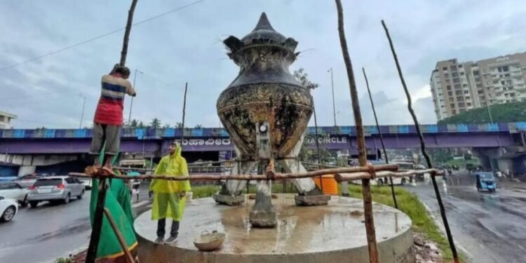 ಮಂಗಳೂರು: ಒಂದು ಕಾಲದಲ್ಲಿ ಮಂಗಳೂರಿನ ಕಿರೀಟ ಎಂದು ಪರಿಗಣಿಸಲಾಗಿದ್ದ ಐತಿಹಾಸಿಕ ಕಲಶವನ್ನು 2016 ರಲ್ಲಿ ಪಂಪ್ವೆಲ್ ಮೇಲ್ವೇತುವೆ ನಿರ್ಮಾಣದ ಸಮಯದಲ್ಲಿ ತೆಗೆದುಹಾಕಲಾಗಿತ್ತು. ಆ ಸಂದರ್ಭದಲ್ಲಿ ಅನೇಕರು ಬೇಸರ ವ್ಯಕ್ತಪಡಿಸಿದ್ದರು. ಇದೀಗ ವರ್ಷಗಳ ನಂತರ, ಪಂಪ್ವೆಲ್ ಮಹಾವೀರ್ ವೃತ್ತದಲ್ಲಿ ಮಂಗಳೂರು ಮುಕುಟವನ್ನು ಪುನಃ ಸ್ಥಾಪಿಸಲಾಗಿದೆ. ಈಗ ಕಲಶವನ್ನು ಪಂಪ್ವೆಲ್ನಿಂದ ಪಡೀಲ್ಗೆ ಹೋಗುವ ರಸ್ತೆಯಲ್ಲಿರುವ ವೃತ್ತದಲ್ಲಿ ಇರಿಸಲಾಗಿದೆ.