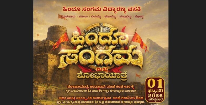 ಪುತ್ತೂರು: ಪುತ್ತೂರು ನಗರದ ವಿದ್ಯಾರಣ್ಯ ವಸತಿಯ ಹಿಂದೂ ಸಂಗಮ ಮತ್ತು ಶೋಭಾಯಾತ್ರೆ ಫೆ. 1ರಂದು ಸಂಜೆ 4.30ರಿಂದ ಪುತ್ತೂರು ಶ್ರೀ ಲಕ್ಷ್ಮೀವೆಂಕಟರಮಣ ದೇವಸ್ಥಾನದ ಶ್ರೀ ಸುಕೃತೀಂದ್ರ ಸಭಾಭವನದಲ್ಲಿ ನಡೆಯಲಿದೆ.