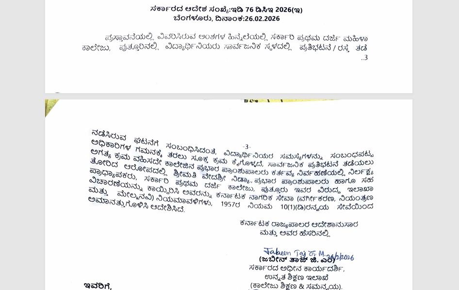 ಪುತ್ತೂರು: ಪುತ್ತೂರಿನ ಸರ್ಕಾರಿ ಪ್ರಥಮ ದರ್ಜೆ ಮಹಿಳಾ ಕಾಲೇಜಿನ ಪ್ರಭಾರ ಪ್ರಾಂಶುಪಾಲೆ ಹಾಗೂ ಅರ್ಥಶಾಸ್ತ್ರ ವಿಭಾಗದ ಸಹ ಪ್ರಾಧ್ಯಾಪಕಿ ಶ್ರೀಮತಿ ವೇದಶ್ರೀ ನಿತ್ಯಾ ಅವರನ್ನು ಸೇವೆಯಿಂದ ಅಮಾನತುಗೊಳಿಸಿ ರಾಜ್ಯ ಸರ್ಕಾರ ಆದೇಶ ಹೊರಡಿಸಿದೆ.ವಿದ್ಯಾರ್ಥಿನಿಯರು ಸಾರ್ವಜನಿಕ ಸ್ಥಳದಲ್ಲಿ ಪ್ರತಿಭಟನೆ ಹಾಗೂ ರಸ್ತೆ ತಡೆ ನಡೆಸಿದ ಪ್ರಕರಣಕ್ಕೆ ಸಂಬಂಧಿಸಿದಂತೆ ಕರ್ತವ್ಯ ನಿರ್ವಹಣೆಯಲ್ಲಿ ನಿರ್ಲಕ್ಷ್ಯ ತೋರಿದ ಆರೋಪದ ಮೇರೆಗೆ ಈ ಕ್ರಮ ಕೈಗೊಳ್ಳಲಾಗಿದೆ.