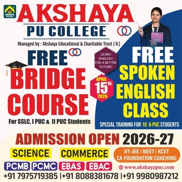 ವಿದ್ಯಾರ್ಥಿಗಳ ಶೈಕ್ಷಣಿಕ ಅಭಿವೃದ್ಧಿ ಹಾಗೂ ಭವಿಷ್ಯದ ಸ್ಪರ್ಧಾತ್ಮಕ ಪರೀಕ್ಷೆಗಳ ಸಿದ್ಧತೆಯನ್ನು ಗಮನದಲ್ಲಿಟ್ಟುಕೊಂಡು ಅಕ್ಷಯ ಪಿಯು ಕಾಲೇಜು ಮಹತ್ವದ ಹೆಜ್ಜೆಯನ್ನು ಇಟ್ಟಿದೆ. ಸಂಸ್ಥೆಯ ವತಿಯಿಂದ “ಫ್ರೀ ಬ್ರಿಡ್ಜ್ ಕೋರ್ಸ್” ಮತ್ತು “ಫ್ರೀ ಸ್ಪೋಕನ್ ಇಂಗ್ಲಿಷ್ ಕ್ಲಾಸ್” ಕಾರ್ಯಕ್ರಮಗಳನ್ನು ಏರ್ಪಡಿಸಲಾಗಿದ್ದು, ಈ ಕೋರ್ಸ್ಗಳು ಏಪ್ರಿಲ್ 15, 2026ರಿಂದ ಅಧಿಕೃತವಾಗಿ ಆರಂಭವಾಗಲಿವೆ.