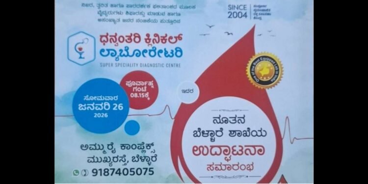 ಪುತ್ತೂರು: ಧನ್ವಂತರಿ ಕ್ಲಿನಿಕಲ್ ಲ್ಯಾಬೋರೇಟರಿಯ ನೂತನ ಬೆಳ್ಳಾರೆ ಶಾಖೆಯ ಉದ್ಘಾಟನಾ ಸಮಾರಂಭ ಜ. 26ರಂದು ಬೆಳಿಗ್ಗೆ 8.15ಕ್ಕೆ ಬೆಳ್ಳಾರೆ ಮುಖ್ಯರಸ್ತೆಯ ಅಮ್ಮು ರೈ ಕಾಂಪ್ಲೆಕ್ಸ್’ನಲ್ಲಿ ನಡೆಯಲಿದೆ.