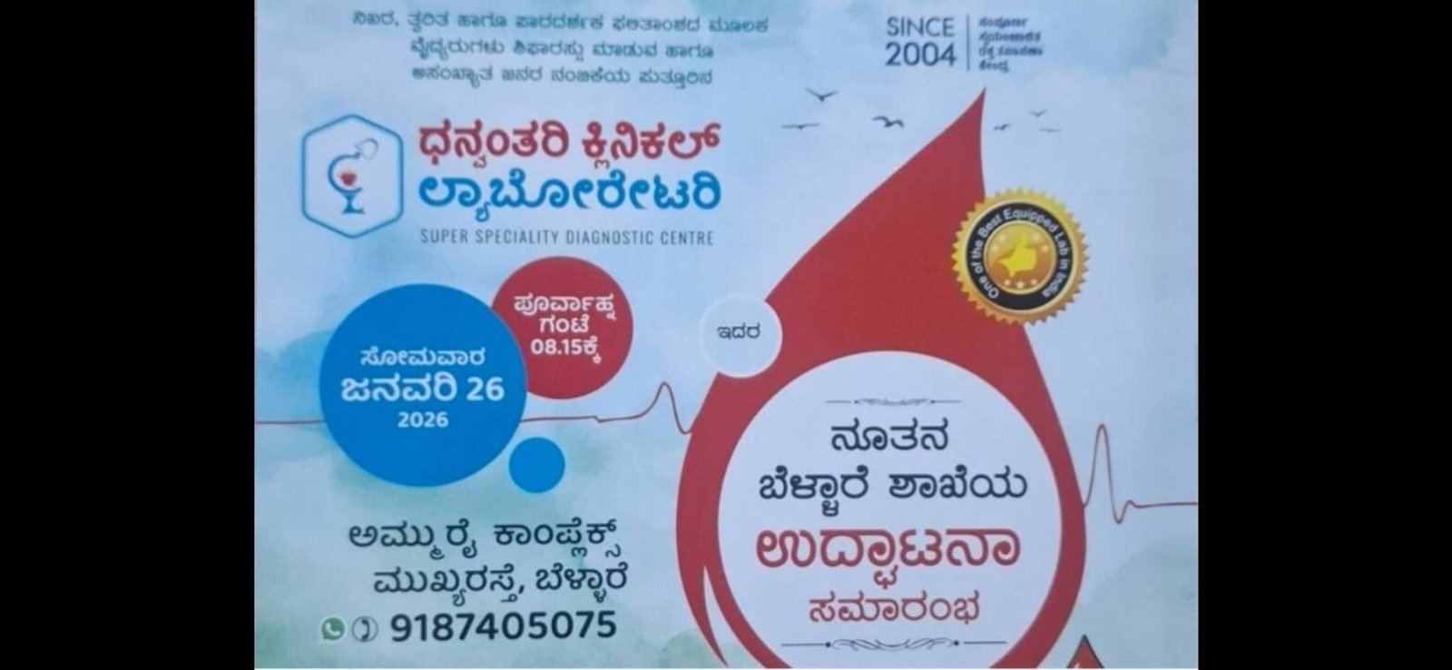 ನಿಖರ, ತ್ವರಿತ ಹಾಗೂ ಪಾರದರ್ಶಕ ಫಲಿತಾಂಶದ ಅಸಂಖ್ಯಾತ ಜನರ ವಿಶ್ವಾಸ ಗಳಿಸಿರುವ ಧನ್ವಂತರಿ ಕ್ಲಿನಿಕಲ್ ಲ್ಯಾಬೋರೇಟರಿ, ಸೂಪರ್ ಸ್ಪೆಷಾಲಿಟಿ ಡಯಾಗ್ನೋಸ್ಟಿಕ್ ಸೆಂಟರ್ ಆಗಿದೆ. ಪುತ್ತೂರಿನಲ್ಲಿ ಜನಮನ್ನಣೆ ಗಳಿಸಿ, ಇದೀಗ ಬೆಳ್ಳಾರೆಯಲ್ಲಿಯೂ ಶಾಖೆ ತೆರೆಯುತ್ತಿದ್ದು, ಬೆಳ್ಳಾರೆ ಜನರ ಸೇವೆಗೆ ಮುಂದಾಗಿದೆ.