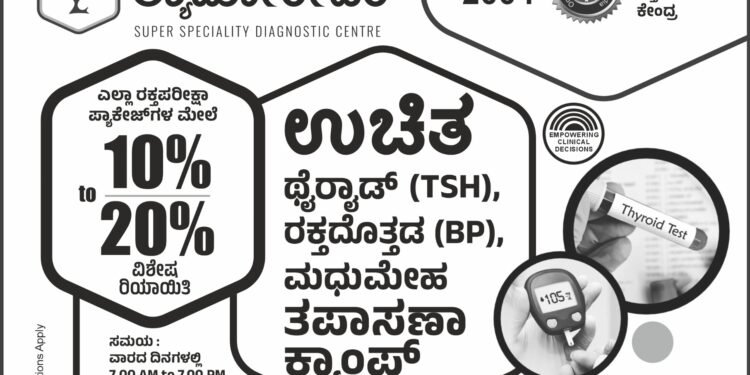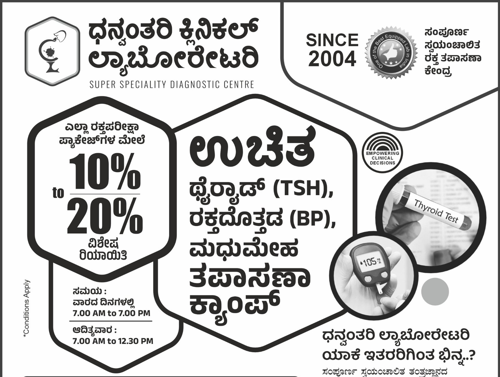 ಧನ್ವಂತರಿ ಕ್ಲಿನಿಕಲ್ ಲ್ಯಾಬೋರೇಟರಿಯ ಬೆಳ್ಳಾರೆ ಶಾಖೆಯಲ್ಲಿ ಏ. 11ರಂದು ಮಧುಮೇಹ, ಥೈರಾಯ್ಡ್, ರಕ್ತದೊತ್ತಡ ಉಚಿತ ತಪಾಸಣಾ ಶಿಬಿರ ನಡೆಯಲಿದೆ.