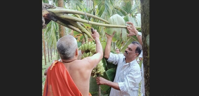 ದೇವಸ್ಥಾನ ಸಮೀಪದ ವೆಂಕಪ್ಪ ಗೌಡ ಕಾಣಿಕೆ ಅವರ ತೋಟದಿಂದ ಗೊನೆ ಕಡಿದು, ದೇವಸ್ಥಾನಕ್ಕೆ ತರಲಾಯಿತು.