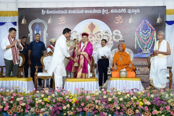 ಹನುಮಗಿರಿ ಶ್ರೀ ಕೋದಂಡರಾಮ ಪಂಚಮುಖಿ ಕ್ಷೇತ್ರದಲ್ಲಿ ನಡೆಯುತ್ತಿರುವ ಅಷ್ಟಬಂಧ ಬ್ರಹ್ಮಕಲಶೋತ್ಸವದಲ್ಲಿ ಶುಕ್ರವಾರ, ಕ್ಷೇತ್ರದ ಮುಖ್ಯ ನೂತನ ಗೋಪುರ ಹಾಗೂ ನವೀಕೃತ ಉದ್ಯಾನವನ ಲೋಕಾರ್ಪಣೆ ಮಾಡಿ ಮಾತನಾಡಿದರು.