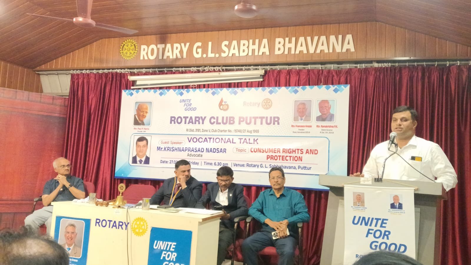 ರೋಟರಿ ಕ್ಲಬ್ ಪುತ್ತೂರು ವತಿಯಿಂದ ಆಯೋಜಿಸಲಾದ “ಗ್ರಾಹಕ ಹಕ್ಕುಗಳು ಮತ್ತು ಹಿತರಕ್ಷಣೆ” ಉಪನ್ಯಾಸ ಕಾರ್ಯಕ್ರಮದಲ್ಲಿ ಸಂಪನ್ಮೂಲ ವ್ಯಕ್ತಿಯಾಗಿ ಮಾತನಾಡಿದ ಅವರು, ಇ-ಕಾಮರ್ಸ್ ಯುಗದಲ್ಲಿ ಎಷ್ಟೇ ಎಚ್ಚರಿಕೆಯಿಂದ ವ್ಯವಹಾರ ನಡೆಸಿದರೂ ಮೋಸಗಳ ಸಂಭವ ಹೆಚ್ಚಾಗುತ್ತಿರುವುದನ್ನು ಉಲ್ಲೇಖಿಸಿದರು.
