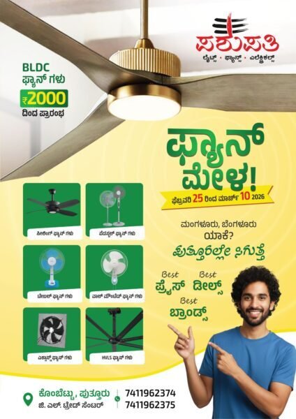 ಪುತ್ತೂರು: ಲೈಟಿಂಗ್ ಕ್ಷೇತ್ರದಲ್ಲಿ ವಿಶೇಷ ಛಾಪು ಮೂಡಿಸಿರುವ ಪುತ್ತೂರಿನ ಕೊಂಬೆಟ್ಟಿನಲ್ಲಿರುವ ಪಶುಪತಿ ಲೈಟ್ಸ್, ಫ್ಯಾನ್ಸ್, ಎಲೆಕ್ಟ್ರಿಕಲ್ಸ್’ನಲ್ಲಿ ಬುಧವಾರ ಫ್ಯಾನ್ ಮೇಳ ಆರಂಭಗೊಳ್ಳಲಿದೆ.