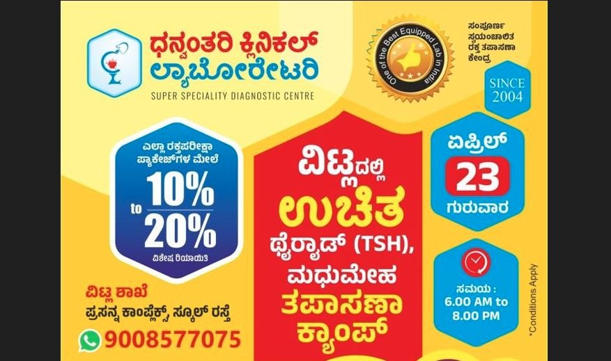 ವಿಟ್ಲದ ಸ್ಕೂಲ್ ರಸ್ತೆಯಲ್ಲಿರುವ ಪ್ರಸನ್ನ ಕಾಂಪ್ಲೆಕ್ಸ್ ನಲ್ಲಿರುವ ಧನ್ವಂತರಿ ಕ್ಲಿನಿಕಲ್ ಲ್ಯಾಬೊರೇಟರಿ ಸೂಪರ್ ಸ್ಪೆಷಾಲಿಟಿ ಡಯಾಗ್ನಾಸ್ಟಿಕ್ ಸೆಂಟರ್ ನಲ್ಲಿ ಕ್ಯಾಂಪ್ ನಡೆಯಲಿದ್ದು, ಸಾರ್ವಜನಿಕರು ಇದರ ಸದುಪಯೋಗ ಪಡೆದುಕೊಳ್ಳಬಹುದು.